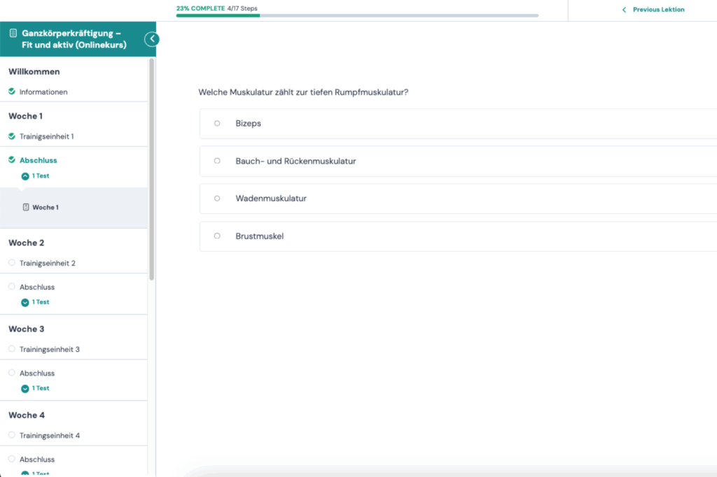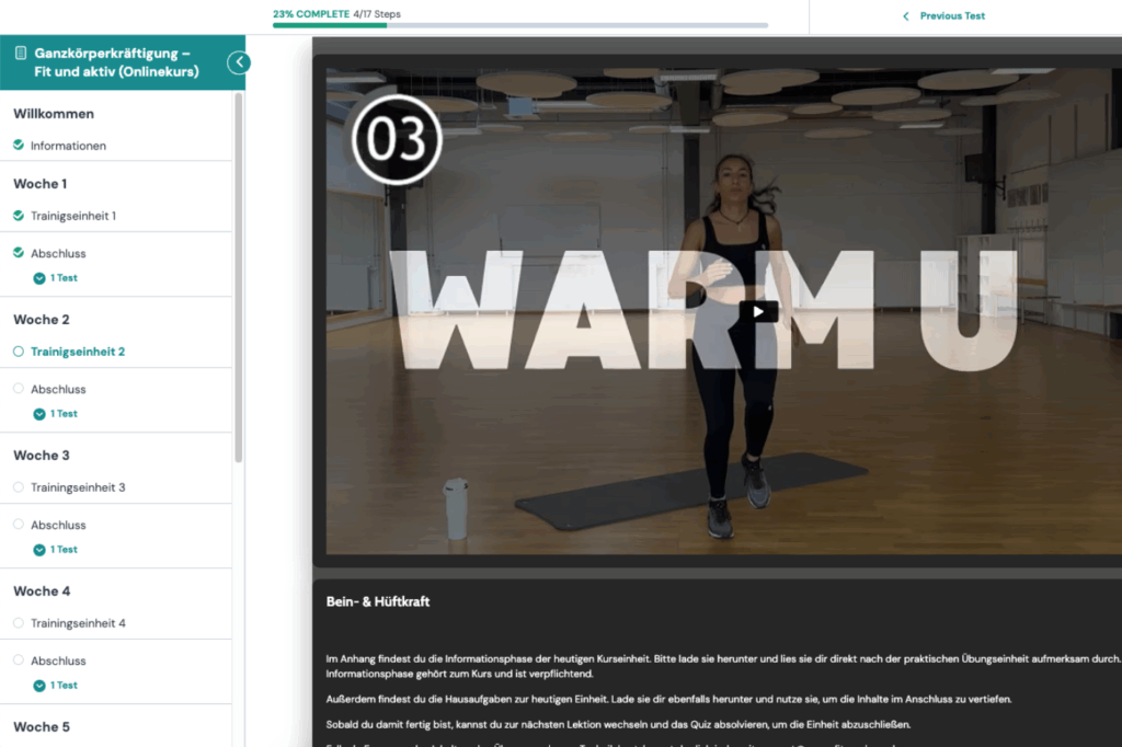 Nachdem du unseren zertifizierten Kurs gebucht hast, erhältst du direkt Zugang zu unserer Kursplattform und kannst mit dem Fitnessprogramm starten.